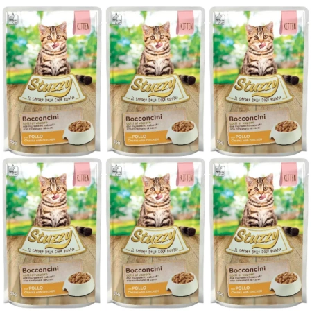 - Stuzzy Bocconcini Mokra Karma dla Kociąt Kurczak 6x85g jest to zestaw 6 saszetek kompletnej mokrej karmy dla kociąt.