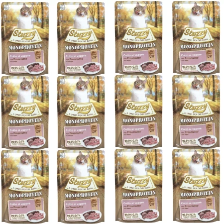 - Stuzzy Karma Monoproteinowa dla Kota Szynka 12x85g to pyszny zestaw 12 saszetek karmy dla Twojego kota, ze smakowitym prosciutto. Jest to karma monobiałkowa, zwana również monoprotein, czyli z jednym źródłem białka zwierzęcego.