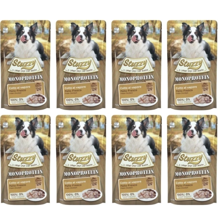- Stuzzy Monoprotein Karma dla Psa Kurczak Saszetka 8x150g to karma mięsna dla psów dorosłych. Jest to karma monobiałkowa, zwana również monoprotein, czyli z jednym źródłem białka zwierzęcego.