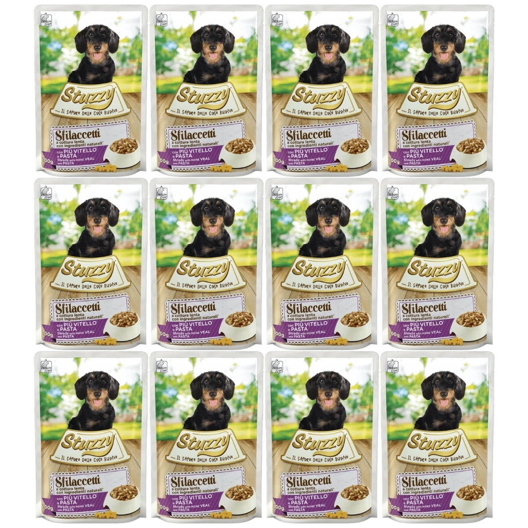 Stuzzy Sfilaccetti Karma Mokra dla Psa Cielęcina Makaron 12x100g to zestaw 12 saszetek po 100 g każda.