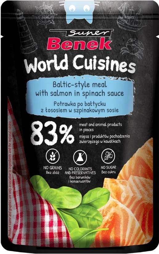 Szukasz smakowitego dania dla swojego mruczka? Super Benek World Cuisines Potrawka po Bałtycku z Łososiem w Szpinakowym Sosie to wyjątkowa propozycja, która przeniesie Twojego pupila w świat wykwintnych smaków.