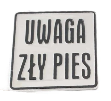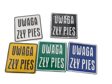 Tabliczka z napisem "uwaga zły pies" lub "uwaga pies" w zależności od koloru.