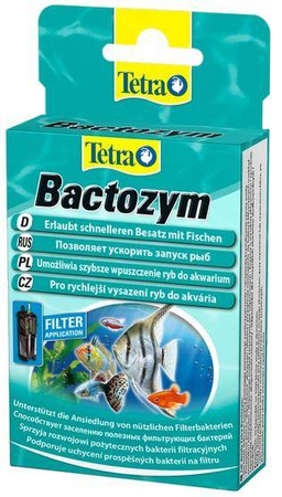 Tetra Bactozym przyspiesza biologiczną aktywację akwarium. Naturalne, organiczne koloidy pokrywają wkład filtra i wszystkie powierzchnie niewidoczną warstwą, wspomagającą rozwój kolonii pożytecznych bakterii filtracyjnych. Oznacza to możliwość wpuszczenia pierwszej partii ryb już po 24 godzinach od przygotowania nowego akwarium. Zarówno wodę, jak i filtr można wymieniać bez istotnej utraty aktywności biologicznej.