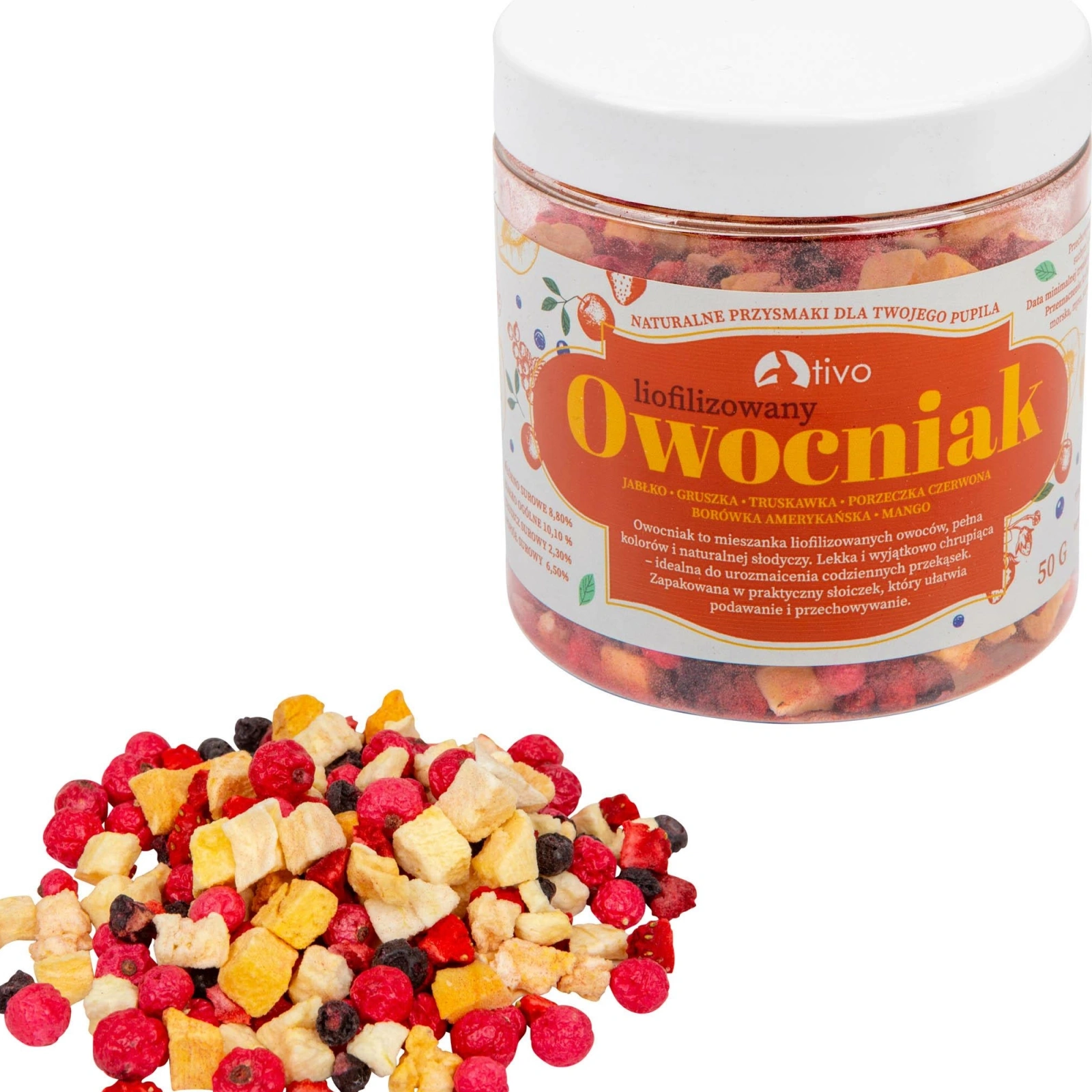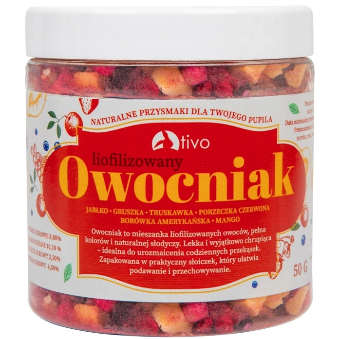 - TIVO Przysmak dla Gryzoni Owocniak Liofilizowany 50g to naturalna mieszanka, która wzbogaci dietę Twojego pupila.