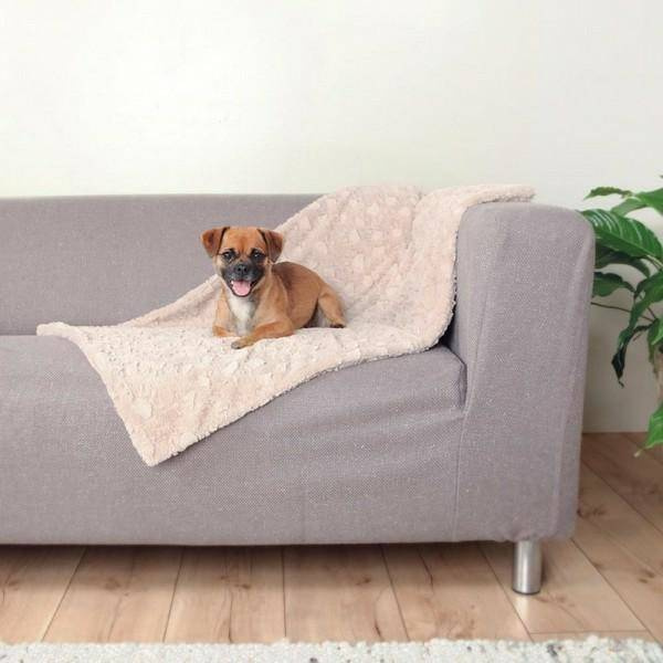 Beżowy kocyk w tłoczony wzór łapek. Świetnie sprawdzi się jako koc dla psów oraz kotów.