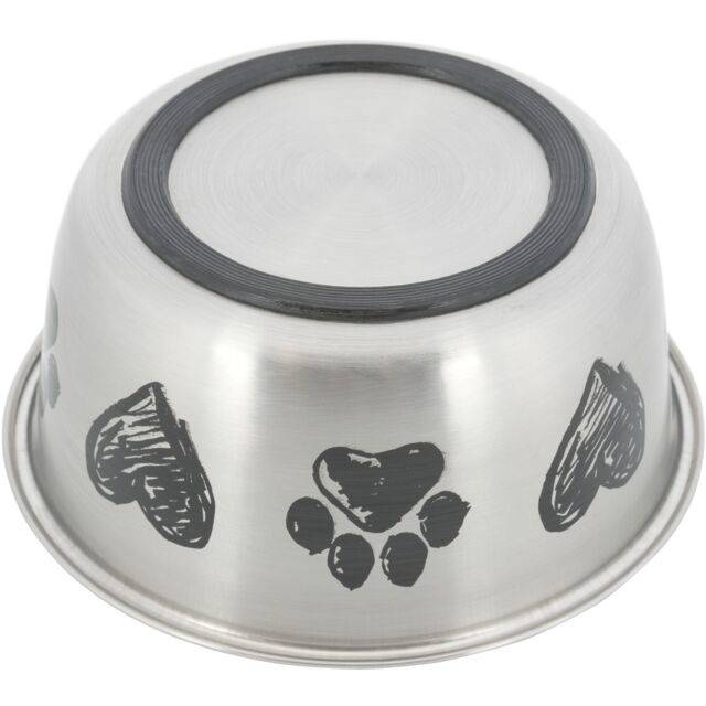 • Trixie Metalowa Miska dla Psa Kota Srebrna 0,5l to urocza miska na pokarm lub wodę dla Twojego psa i kota, z czarnym wzorem łapek i serduszek.