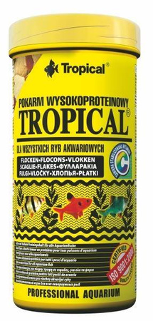 TROPICAL wysokobiałkowy pokarm w formie płatków. Płatki TROPICAL przeznaczone są do codziennego karmienia ryb wszystkożernych i mięsożernych. Regularne stosowanie pokarmu TROPICAL zapewnia efektywny przyrost masy ciała i dostarcza niezbędnych witamin oraz mikro- i makroelementów.