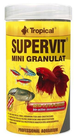 SUPERVIT MINI GRANULAT wieloskładnikowy pokarm w formie minigranulatu z beta-glukanem. SUPERVIT MINI GRANULAT to uniwersalny pokarm w formie drobnego, tonącego granulatu do codziennego karmienia małych ryb akwariowych, dorastającego narybku, krewetek karłowatych oraz przekopnic.