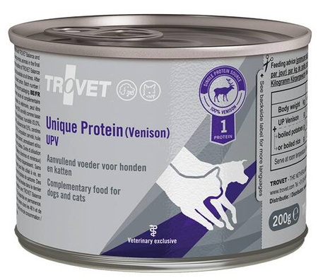 • Trovet Unique Protein UPV Dziczyzna Karma Dla Psa Kota to monoproteinowa karma uzupełniająca stworzona dla psów i kotów o wrażliwym układzie pokarmowym, skłonnym do alergii.