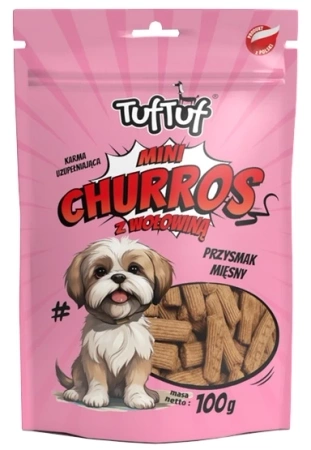 - TUF TUF Przysmak Dla Psa Mini Churros z Wołowiną 100g to smakowita przekąska, która zachwyci Twojego czworonoga.