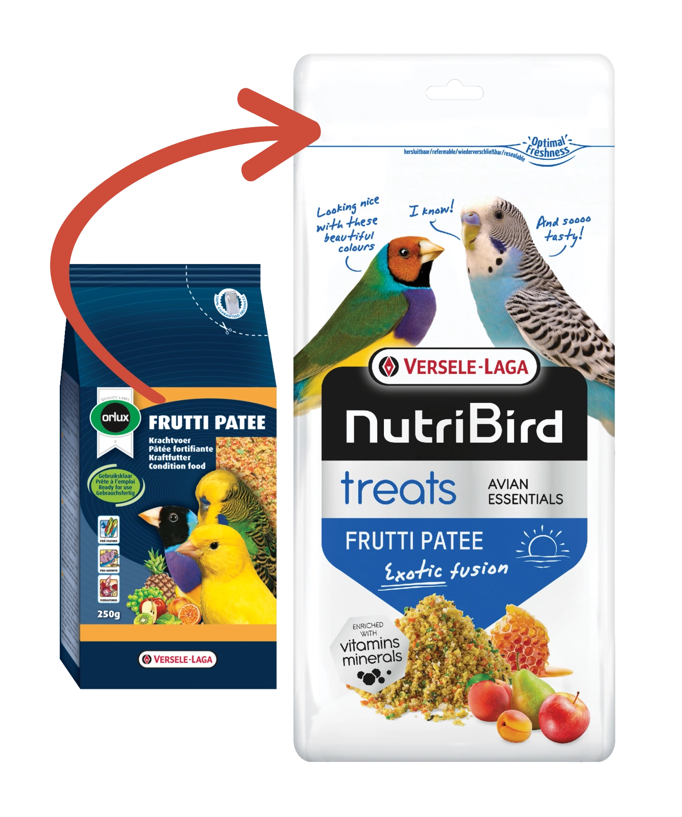 - Versele-Laga Nutribird Frutti Pate Przysmak dla Ptaków 1kg to pożywna mieszanka uzupełniająca dietę ptaków. Z owocami i miodem.