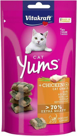 - Vitakraft Kot 40g Yums Kura Z Kocią Trawą to pyszny przysmak dla kotów z kurą.