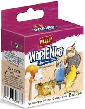 Niezastąpiony suplement ptasiej diety. Wapno jest podstawowym składnikiem budulcowym kośćca, niedobór prowadzi do niedorozwoju i krzywizny, a u starszych ptaków do osłabienia kości i ich łamliwości. Wapń jest również niezbędny do budowy skorupek ptasich jaj w trakcie lęgów oraz w okresie pierzenia. Wapienko zostało dodatkowo wzbogacone pomarańczą, co czyni ją bardziej atrakcyjną i smakowitą.