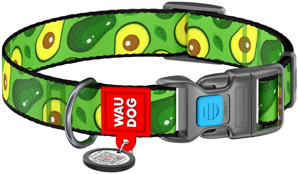 Stylowa obroża dla psa WAUDOG w kolorze zielonym z motywem awokado. Wykonana z solidnej taśmy nylonowej.