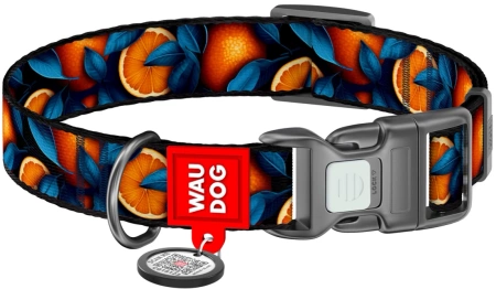 Obroża dla psa WAUDOG w kolorze czarnym, z wakacyjnym motywem pomarańczy.