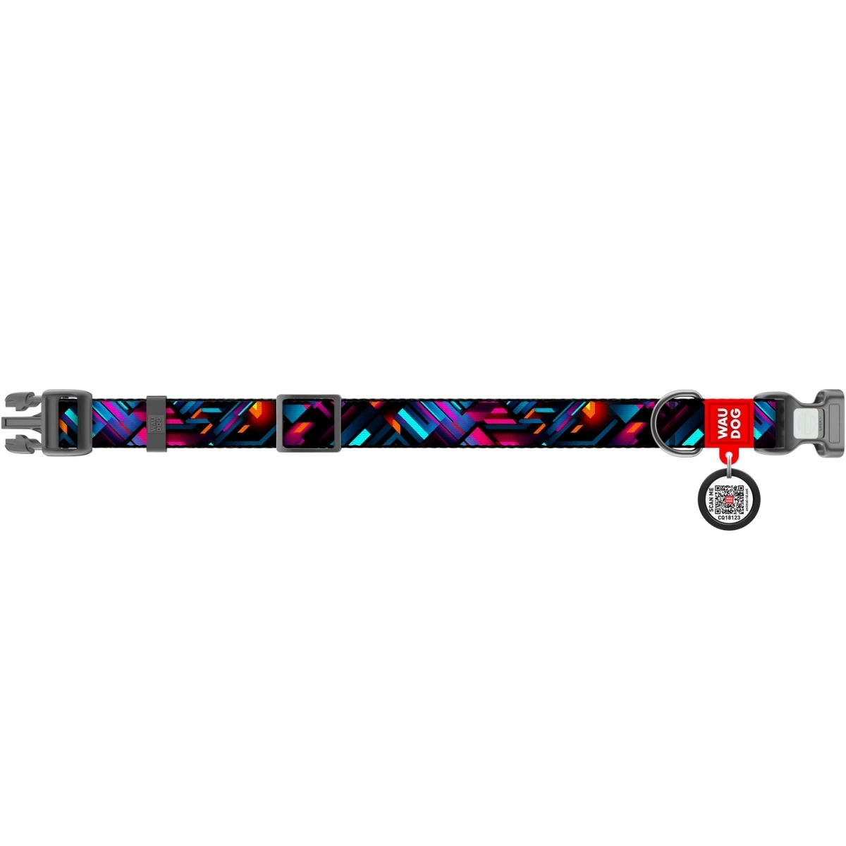 Obroża dla psa WAUDOG z motywem "nieskończonych światów", w geometryczne, kolorowe wzory, na ciemnym tle.