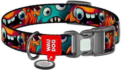 Obroża WAUDOG jest wykonana z taśmy nylonowej w kolorze czarnym, z motywem kolorowych potworków.