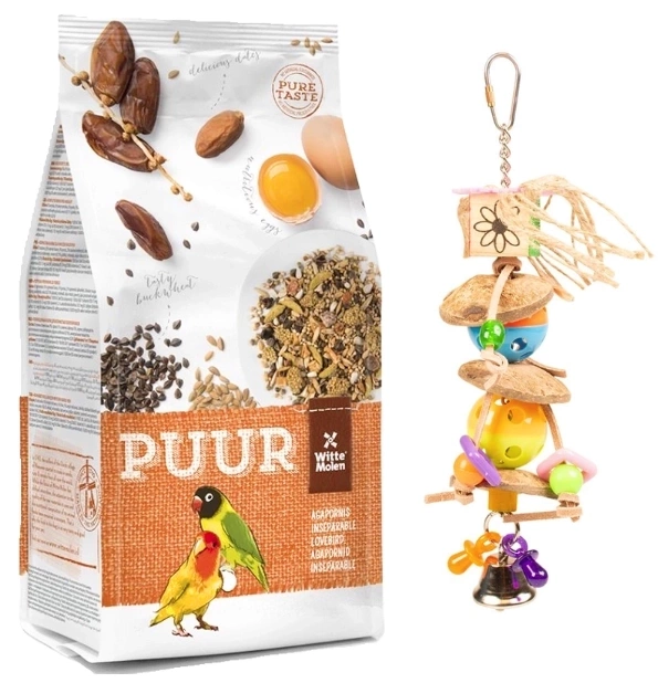 Zestaw zawiera pełnoporcjowa karmę Witte Molen Puur Lovebirds oraz zabawkę dla ptaków Duvo+.