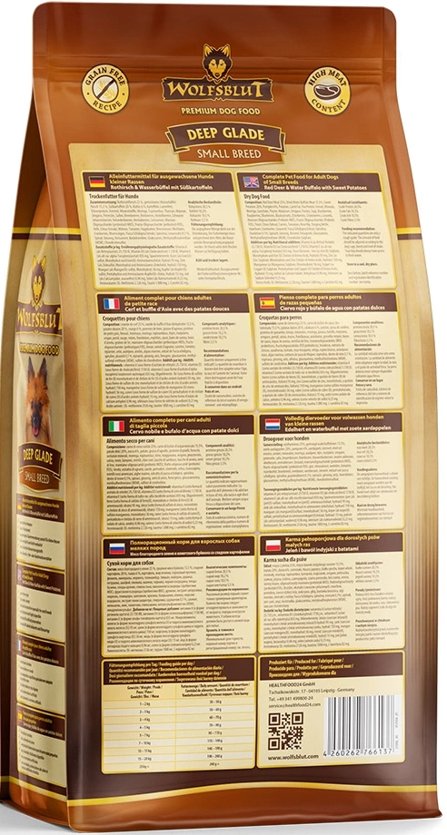 Mięso jelenia 25%, suszone mięso bawoła wodnego 15,5%, słodkie ziemniaki 20%, dynia 6%, ziemniaki, tłuszcz jagnięcy, białko grochu, koper włoski, składniki mineralne, moringa, topinambur, tymianek, majeranek, oregano, pietruszka, szałwia, jeżyny, maliny, jagody, czarne porzeczki, czarny bez, jagody aronii, siemię lniane, mannanooligosacharydy (prebiotyk MOS), fruktooligosacharydy (prebiotyk FOS), drożdże, ekstrakt cytrusowy, marchew, pomidory, owoc dzikiej róży, pokrzywa, głóg, żurawina, algi morskie, ekstrakt z juki schidigera, spirulina, mniszek lekarski 0,1%, szpinak, żeń-szeń, nasiona anyżu, kozieradka, glukozamina, metylosulfonylometan (MSM), siarczan chondroityny.