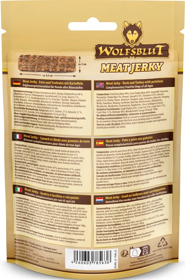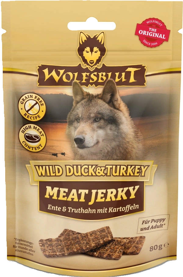 - Wolfsblut Dog Meat Jerky Przysmak dla Psa Kaczka Indyk 80g przekąska dla psów o wyjątkowo wysokiej zawartości mięsa – nagroda i przekąska podczas treningu, w praktycznej, zamykanej torebce.