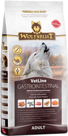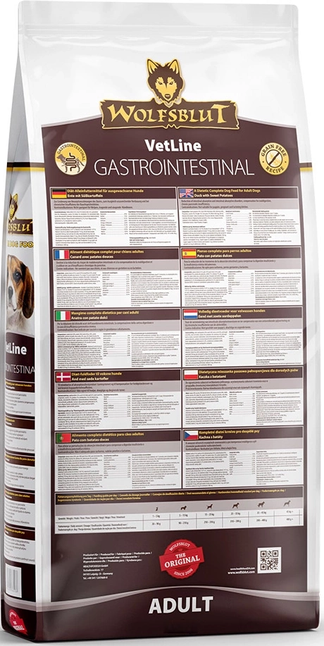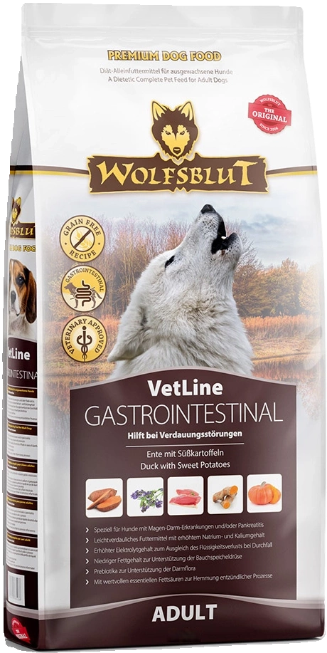 Wolfsblut VetLine GASTROINTESTINAL to kompletna dietetyczna karma dla dorosłych psów, łagodząca zaburzenia wchłaniania jelitowego, kompensująca nieodpowiednie trawienie lub przewlekłą niewydolność trzustki (zapalenie trzustki). Jeśli pies cierpi na biegunkę i wymioty, można rozważyć różne przyczyny. Za to odpowiedzialne są najczęściej zmiany w diecie, zaburzona flora jelitowa, pasożyty, grzyby czy choroby żołądka, jelit czy trzustki. Jeżeli biegunka i wymioty trwają kilka dni, następuje utrata ważnych minerałów i organizm popada w stan niedoboru. W przypadku zaburzeń wchłaniania pies ma trudności z prawidłowym trawieniem pokarmu z powodu np. zapalenia błony śluzowej jelit.