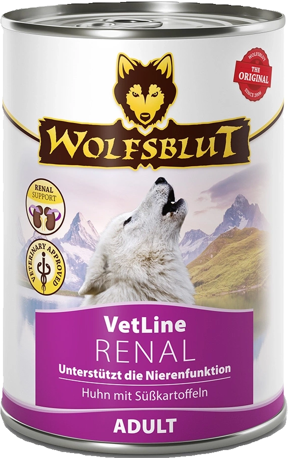 - Wolfsblut Dog VetLine Renal Karma dla Psa 395g to dietetyczna karma pełnoporcjowa dla dorosłych psów, która wspomaga funkcjonowanie nerek w przypadku przewlekłej niewydolności nerek i ogranicza powstawanie kamieni szczawianowych.