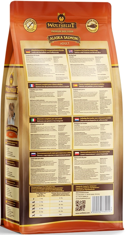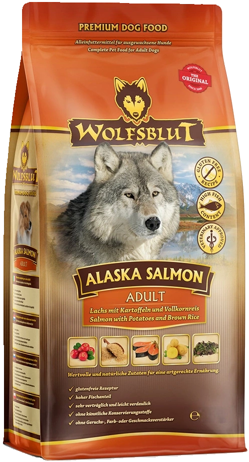 - Wolfsblut Alaska Salmon to pełnoporcjowa sucha karma dla psów dorosłych z łososiem.