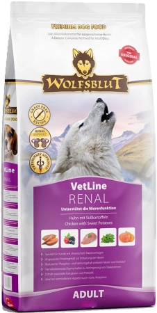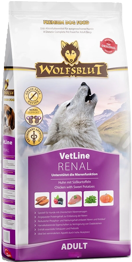 - Wolfsblut Karma Dla Psa VetLine Renal 12kg to specjalistyczna karma dla psów z chorymi nerkami. Ze smakowitym kurczakiem, dynią i batatami. Bez zbóż.