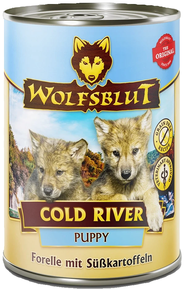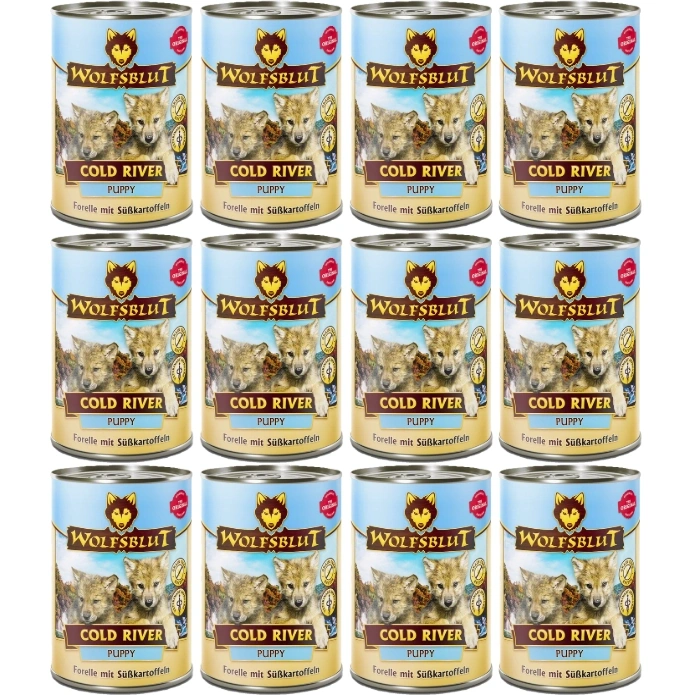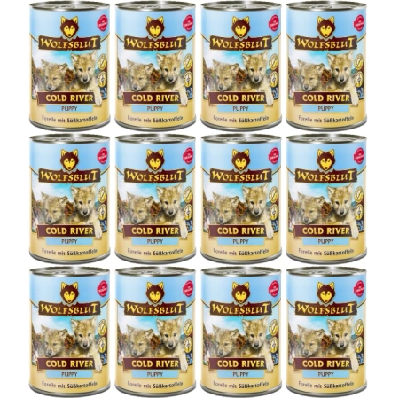 - Wolfsblut Dog Puppy Cold River 12x395g to mokra karma dla szczeniąt z pstrągiem, bez dodatku zbóż.