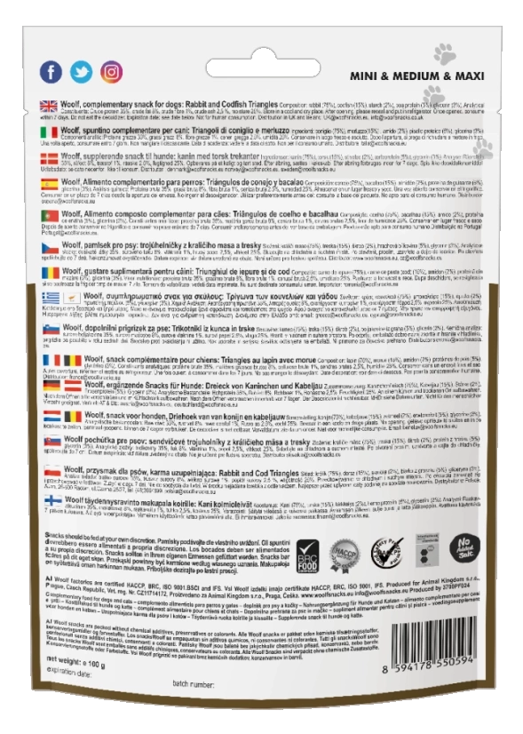 - Woolf Rabbit & COD Triangle to przekąska dla psa w kształcie trójkącików o smaku lekkostrawnego królika z bogatym w zdrowe tłuszcze dorszem.