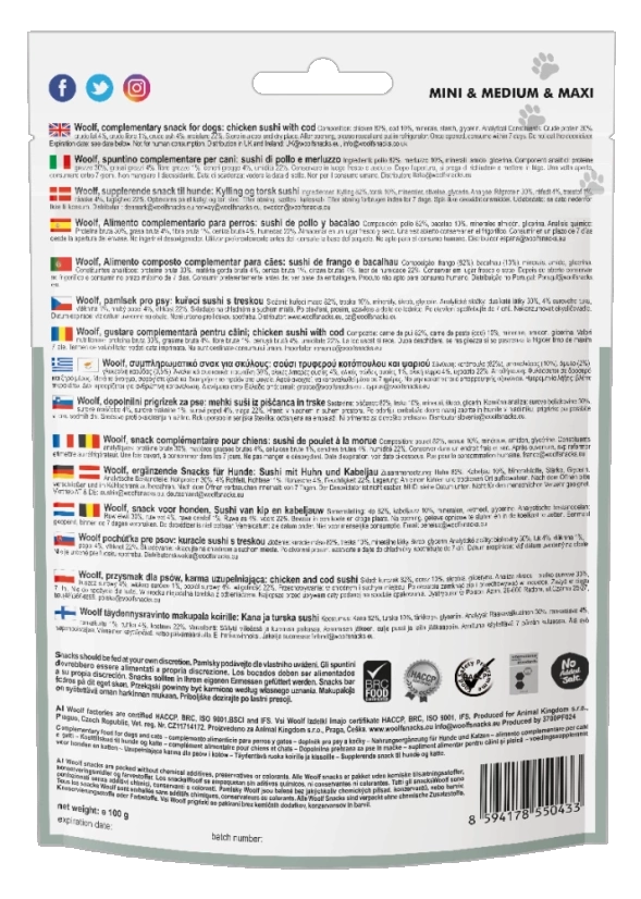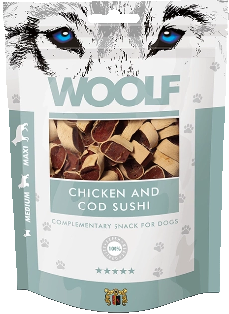 - Woolf Chicken Cod Sushi to smaczny przysmak dla psa w postaci pasków, które łączą smak kurczaka z dorsszem.