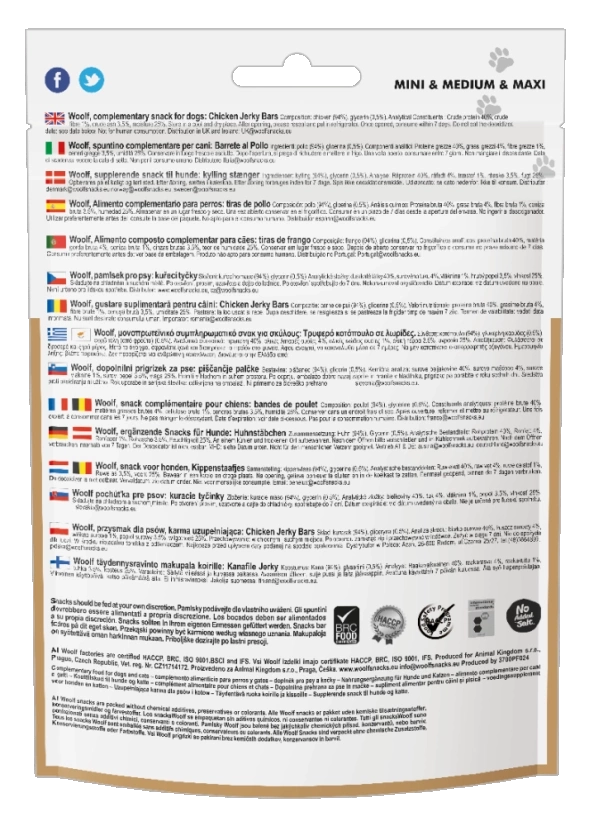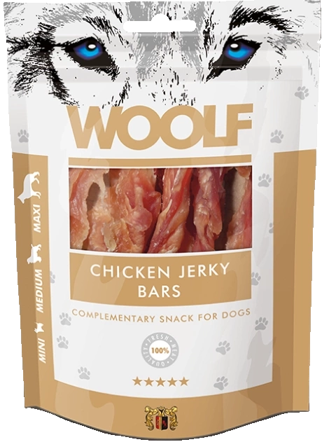 - Woolf Chicken Jerky Bars to przysmak dla psa zawierający ponad 90% mięsa.