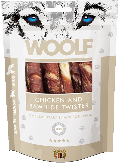 - Woolf Chicken Rawhide Twister to karma uzupełniająca dla psów w postaci patyczków owiniętych kurczakiem.