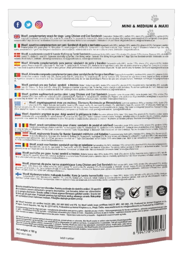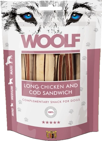 Woolf Przysmak Pies Long Chicken Cod Sandwich, 100G to przysmak, który urozmaici dietę Twojego ulubieńca w niezbędne dla zdrowia witaminy i minerały. Jest idealny do nagradzania psa w trakcie szkolenia lub podczas spaceru. Nie zawiera konserwantów, ani barwników.