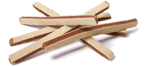 Swietny smakolyk nawet dla malutkich pieskow. Moj dostaje paseczki pociete nożyczkami, zeby bylo bezpiecznie. Mozna takze porwac palcami, wiec sprawdzi sie tez na spacerach. Piesek uwielbia te paseczki.