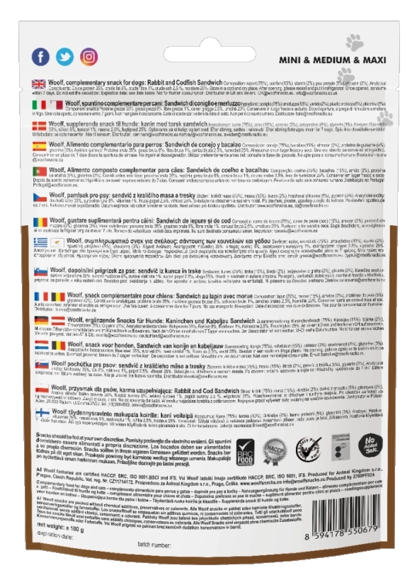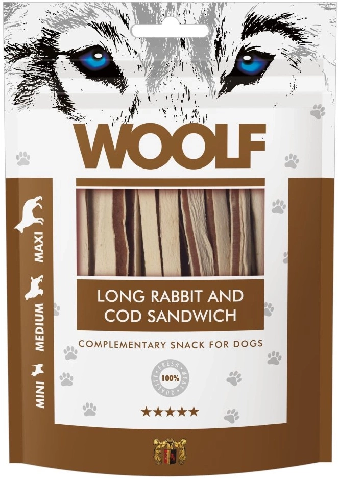 Woolf Przysmak dla Psa 100G Long Rabbit&Cod Sandwich to miękkie kawałeczki z królika dla psów wszystkich ras. Idealne do treningów.