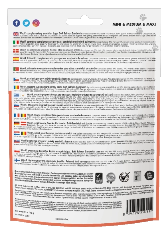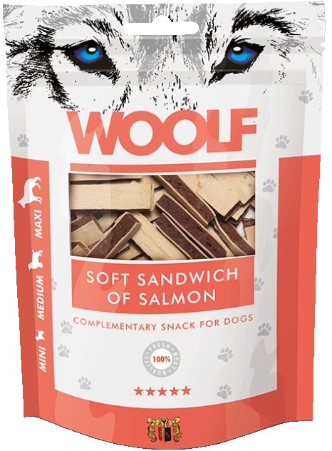 - Woolf Soft Sandwich Salmon to przysmak dla psa w 90% składający się z ryb w postaci mini kanapeczek.