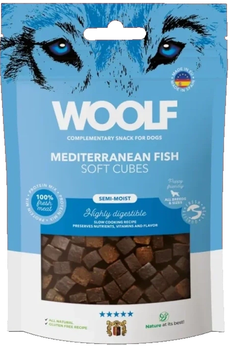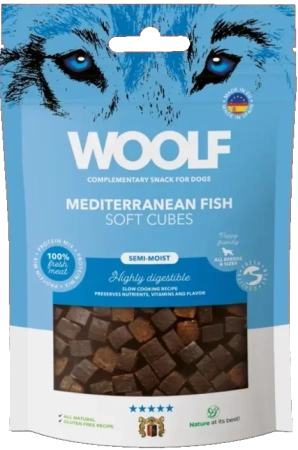 • Woolf Przysmak Dla Psa Soft Cubes Ryba 100g to karma uzupełniająca dla psów wszystkich ras. Delikatne kosteczki z ryb śródziemnomorskich.