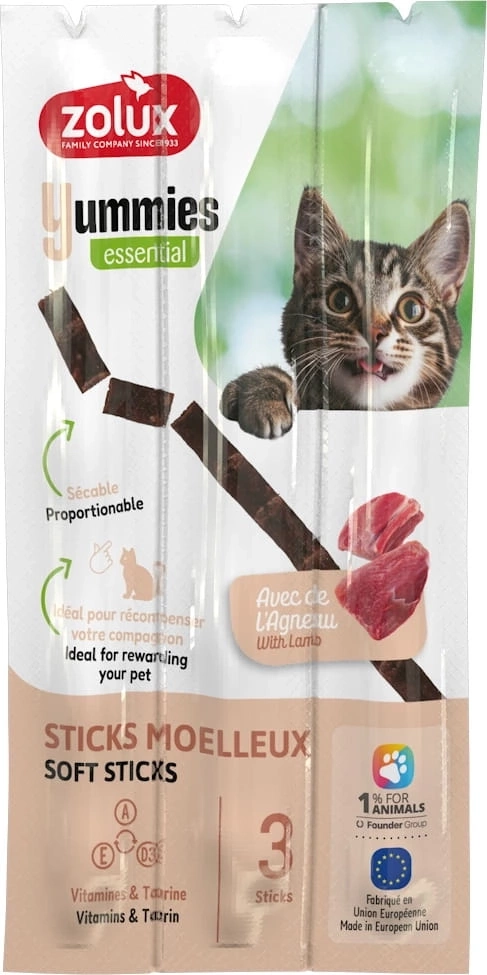 - Zolux Yummies Przysmak dla Kota Jagnięcina Ryż 3x5g to mięsna przekąska, którą pokocha Twój mruczek.