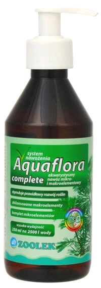 - Zoolek Aquaflora Complete Nawóz dla Roślin Butelka 250ml to preparat mineralny dla roślin akwariowych.